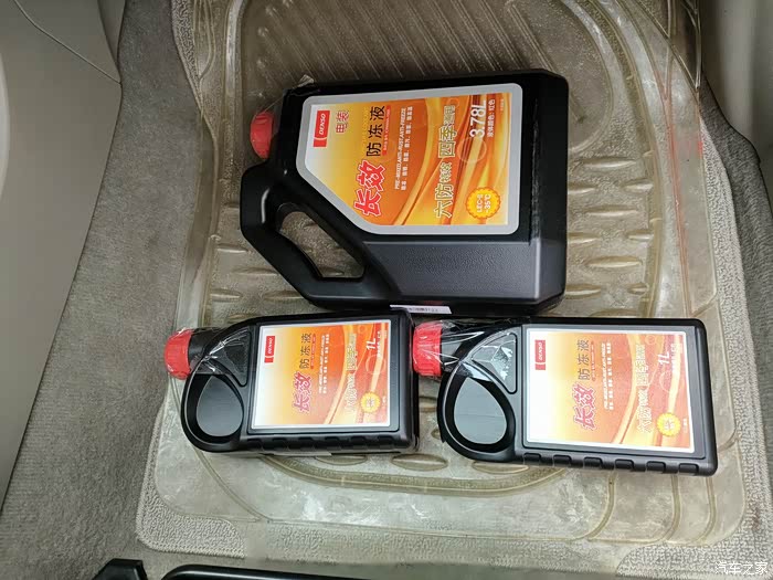 前段时间回家时候,左右无事,就把原车的防冻液给换了,原车的防冻液手册要求是16万公里换,我这个已经14年,10万公里了,更换的原因是今年夏天时候,怠速时间稍微长点,冷却风扇就起动了,启动的频率比以前高了很多,但水温正常一直不高,一直都在合理范围内,原想可能是夏季气温高,启动的频率多,也想过是防冻液问题或节温器问题,想着到春秋季在看看冷却风扇是否也是这样频繁启动(我这无冬季),前段时间气温低,又做了怠速测试,结果还是冷却风扇启动次数多,只是比夏季少点次数。于是决定更换防冻液试试,于是在X装旗舰店购买了一大桶2小桶防冻液(大桶3.75升,小桶1升,合计5.75升)。