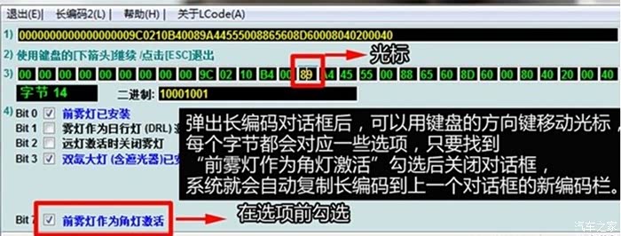 方法:模块--09-中央电气系统”→“编码控制-07”→“长编码帮助”-在一个一个选小框框,应该是第20个,去掉勾选bit1(开启后备箱不打开车内灯),这里要说明的是,查看的时候是没有勾选的,但开启后备箱后车内灯还是会亮,只好打勾后退出执行,然后再取消打勾,退出执行,搞定。