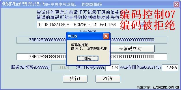 如果原车整段编码52位数粘贴上,后面补零,总是提示编码被拒绝(错误31:请求超出范围)。