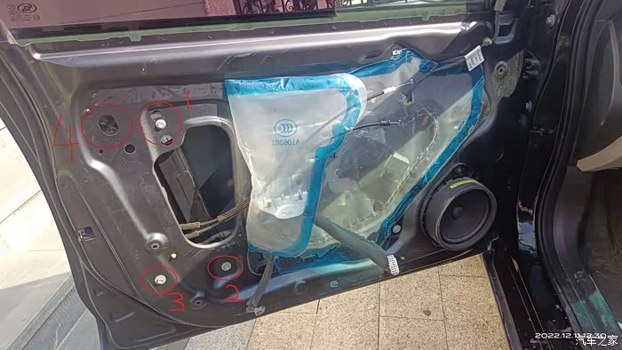 (4)然后安装的时候,先装锁块,然后把3号螺丝位置的胶条穿到滑轨架子里,上紧3号螺丝,因为往右拧螺丝会带动里边架子也往右最好用东西顶一下。然后把线束卡子固定回原来位置。安装玻璃限位器架子,先把4号螺丝那个夹子托住玻璃,然后分别固定1,2号螺丝拧紧,最后把4号螺丝拧紧。额外说一下,如果螺丝掉到门板里,把防水膜往右继续打开,右边那个洞手能够着底,用细长东西在门板里把螺丝扒拉到手能够着地方。