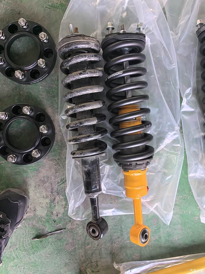 这次主要更换了犀牛九段可调升高两寸的减震器一套6k,四个25mm的长寿龟法兰盘700,和一些配套的附件。安装费800