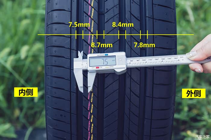 韩泰H462轮胎拥有4条纵向沟槽,从左到右实测宽度为: