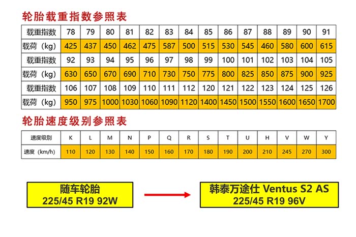 通过数据可以看到,我们的韩泰的H462无论是在载重指数还是在速度级别上都优于随车轮胎的。