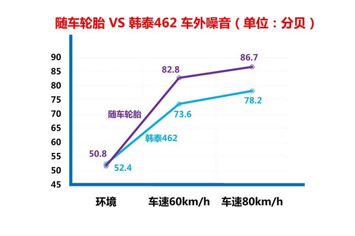由于经验不足的原因,我们测试完韩泰H462的各组数据后,又马上再周边换回了随车轮胎,耽误了不少时间。另外测试现场因客观原因环境噪声也确实存在,所以车外噪声测试成绩仅作为参考。最终车外噪声的成绩也与车内噪声表现一致,韩泰H462的噪声抑制要比随车轮胎好。