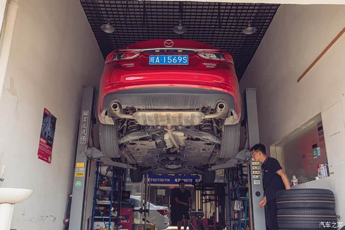 评测前的准备工作要做全了,我们现找到换轮胎的店,车子上了龙门架,就准备换新胎咯。