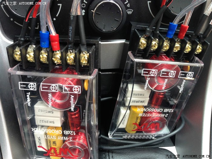 高音头直接装在中控台上的预留位置,走线很轻松,拆开中控台的侧板就可以轻易完成到机头后部的走线,剪断机头后插头的接线,串入分频器,原车的喇叭线接入分频器的低音输出端子,高音头接入分频器的高音输出端子,分频器的输入接到机头的输出,分频器可以用双面胶粘贴到中控台中的空位,比较容易