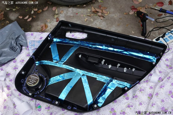 我的时间有限,每次工作都是抽空进行,拆卸门板的方法其他车友都有非常详细的指导书,可以参看进行。门板拆卸后取下原车喇叭,将喇叭上的接线柱用钳子剪断后粘贴到新喇叭上,这样以后再次拆卸可以利用原来的接插件了。喇叭与门板之间用吸音棉剪成小条沾上,然后用热熔胶做好密封,完成我前面提到的障板功能,这个工作很重要,门板内的缝隙用热熔胶全部填充,也可以用防霉玻璃胶,就是头几天味道有点大,我手头有现成的热熔胶工具,所以我选择了热熔胶的方式。然后用止振板将缝隙全部黏住并用压轮压实,其他大面积的空位用止振板呈米字型粘贴,达到止振的目的,由于条件有限,我无法找到更合适的方法增强这个塑料门板的刚性,要知道音箱的前障板要求的强度是非常高的,还请其他车友提供更好更易行的方法。