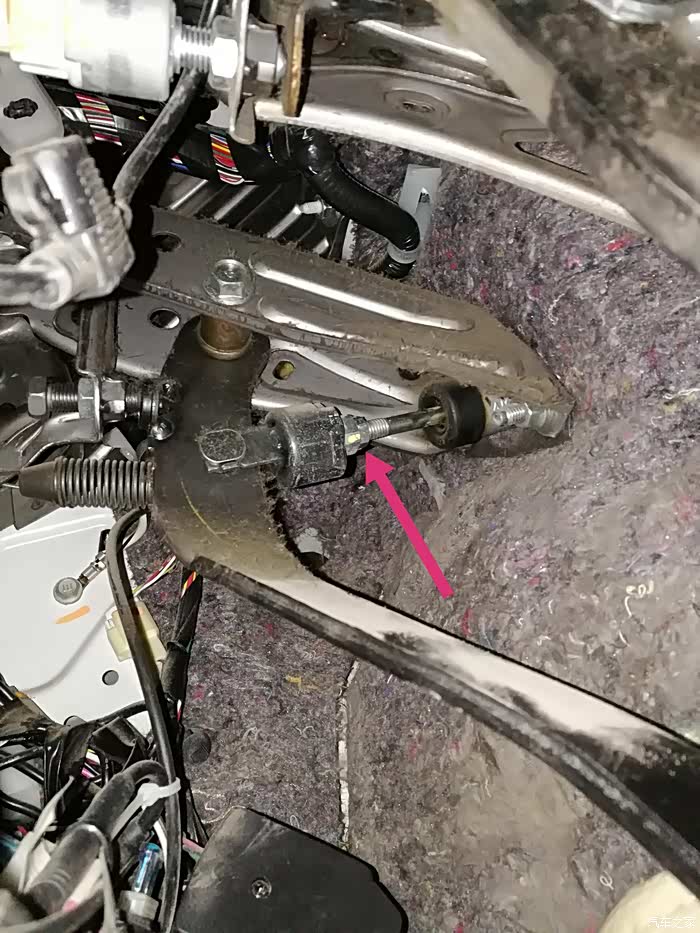 开了7年的花冠29万3千公里,一开始离合就低,加个脚垫都不行,最近天冷挂挡更费力了,于是决定调整一下离合器踏板,钻到方向盘下边,用两把14~12的开口扳手把剪头指的这个螺母松开,然后用手把螺丝杆往发动机舱方向拧,大概2~3圈把(我是拧到用手拧有点费力),然后备死剪头指的两个螺母,OK,可以试车了,再也不用玩命的踩离合了,换挡也不响了。