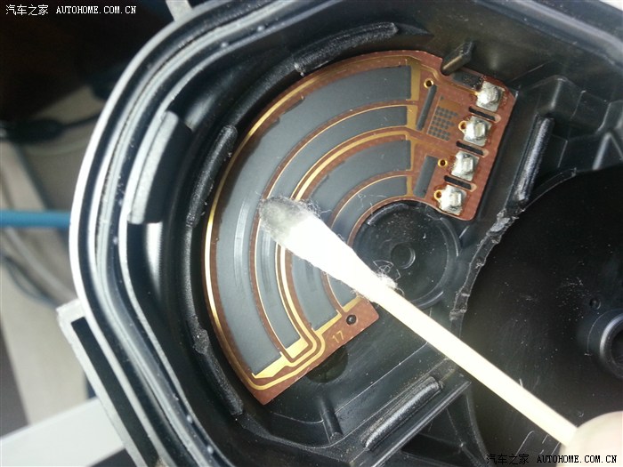 想当初80年代的时候,我经常帮邻居,父母的朋友修理电器,当时收录机的音量旋钮用久了,喇叭里就会出现卡啦,卡啦的噪声,我都是拆开音量电位器,然后用酒精清洁一下碳膜和电刷,因为电位器使用多了,由于电刷的转动,会有一些粉末产生,照成电刷对碳膜的接触不好,同时由于空气的影响,会有一些氧化物在上面。所以我当时就知道的这个节气门传感器的故障根源了。请看下图我来验证是不是这个原因,