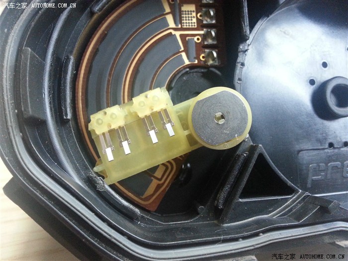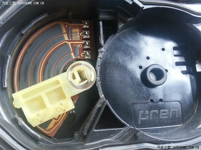 看清除了吗?拆开盖板后,露出位置传感器的真容来了,当时我震惊了,天啊,现在是啥年代了,怎么还在用碳膜电位器的技术啊?没错,其实就是一个碳膜电位器,靠电刷的转动不同位置,对应不同的电阻值,发动机控制单元的处理器就知道对应的节气门开度了。
