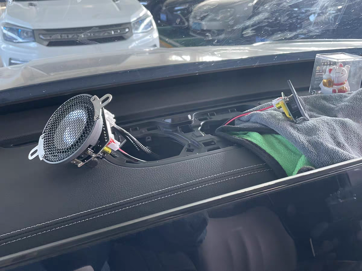 - 检查喇叭安装牢固、线束固定完好后,将中控装饰板对准安装位,从四周轻轻按压,听到“咔哒”声即卡扣卡紧。