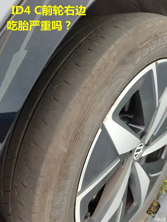 我的ID.4C长续航版,目前行驶5.9万公里,前轮右边轮有吃胎现象(左边没那么严重),后轮两个轮胎从表面上看,没有吃胎现象。