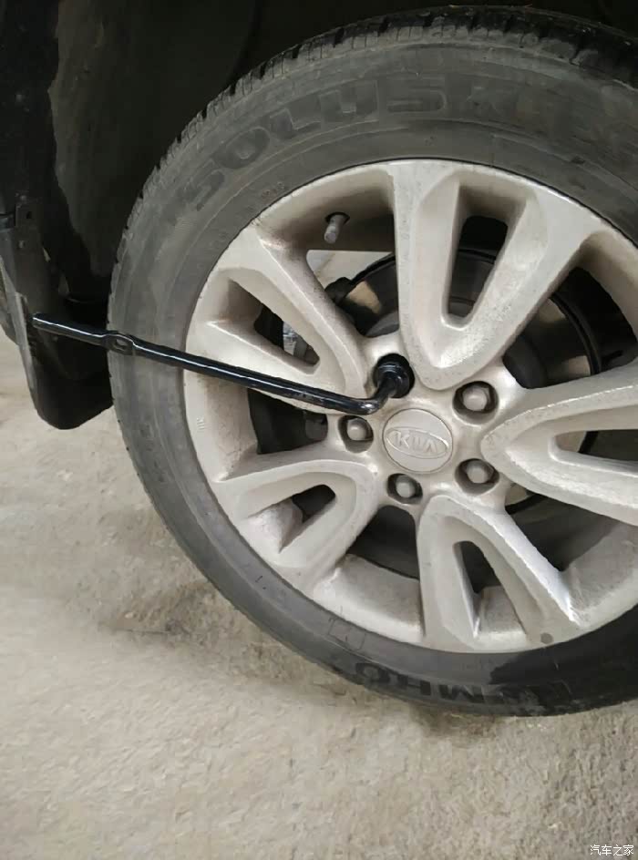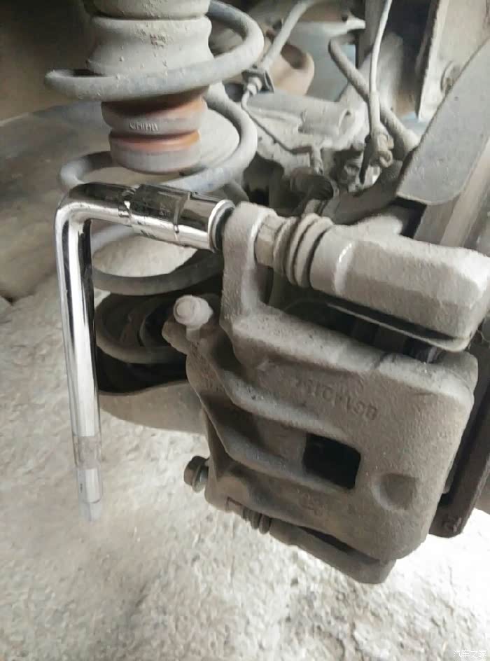 这一步很关键,拆下的卡钳下端用螺丝固定在原上端的螺丝孔位,然后用轮胎扳手一头顶住活塞,使劲撬,把突出的活塞顶平。这样新刹车片装上后,卡钳才塞的进去。这玩意撬的时候挺费劲的,这已经是我在没有专用工具的情况下,试过的最省事的办法了。