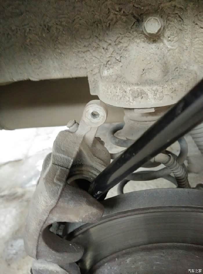 松开螺丝后,用千斤顶的摇杆插进这里轻轻一撬,卡钳就能取下来了。