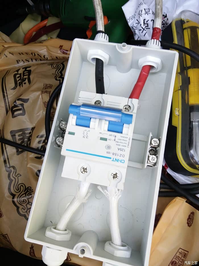 125A大空开固定线缆中。。。看到上下的区别了没。。。我都上好螺丝了。发现防水套忘了套。。。悲催,拆下来重新装