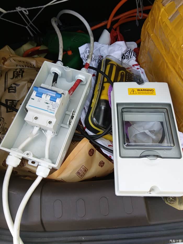 我凌乱的后备箱和那块180斤的大电池。。。接头部分用线缆捆扎好,这几天在淘宝买魔术贴,准备给沾到车的后备箱垫上。