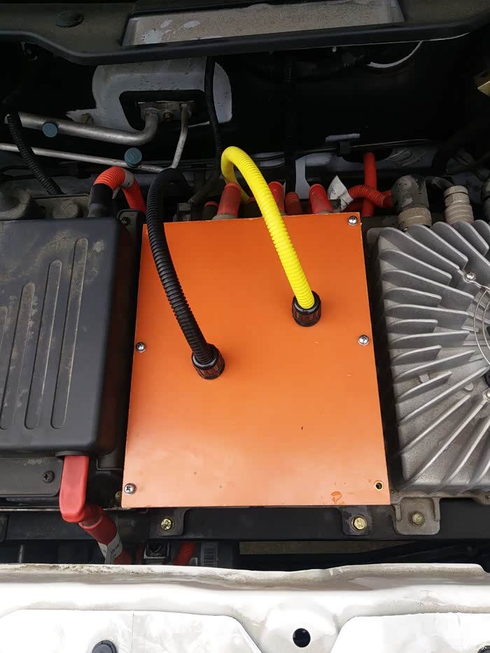 等电池的过程中,先把车的线路搞定,因为这次增加续航的主要目的是为了到4S店更换我那些有问题的部件。在前面高压分线箱内打孔走线,我很担心4儿子会以改装为名拒绝保修,将来审车某个警官可能也会打麻烦,所以买了一块3MM电木板,来替代原车的盖板。审车或者到4S店保养的时候,可以撤下改装,换成原来盖板。