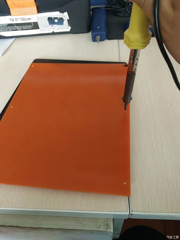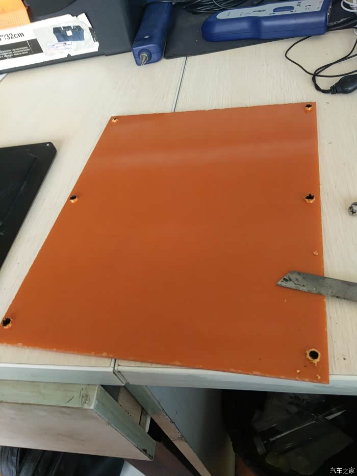 买的是3MM的电木板,厚度硬度都足够了。这里不建议购买5MM的,因为电木加工,一般的工具不行,硬度太大。这6个螺丝孔我原来琢磨用手枪钻直接打孔,但是电木硬、脆,怕手枪钻靠边打孔直接给打裂,于是用最土的办法,用电烙铁直接烙了6个孔,倒是歪打正着,刚好和原车螺丝孔合适。