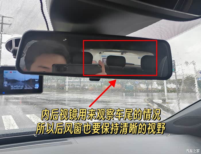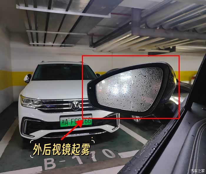 另外,在潮湿的天气里,车辆在进入地下车库的时候,后视镜的镜片也会像下图一样产生雾气,导致我们在倒车的时候完全看不清后方的情况,所以,在主驾驶门板上,我们可以提前打开后视镜加热功能,该功能通过镜片内部电热丝的迅速升温,从而驱散镜片表面的雾气和水珠,确保在倒车时也能够保持清晰的视野。