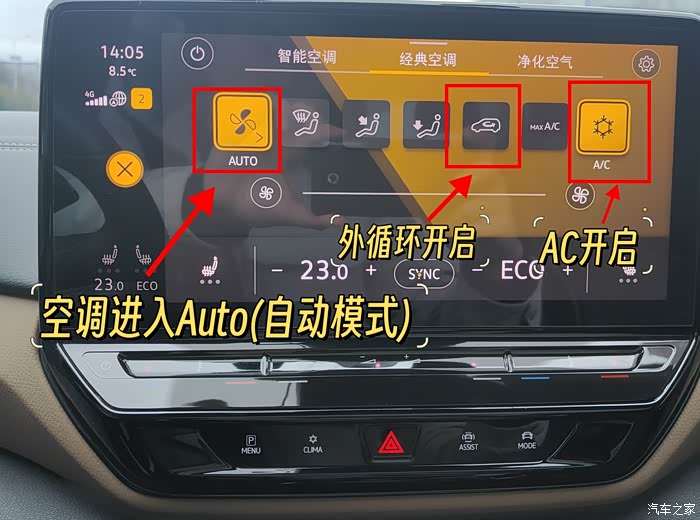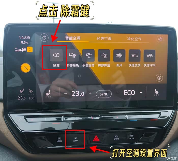 第二个除雾方法也很简单,打开CLIMA空调菜单,在智能空调界面里可以点击“除霜”键,此时空调会进入Auto模式,会自动调节温度和湿度,以保持车内适宜的环境。外循环功能的开启可以引入新鲜空气,有助于加速车内外温差的平衡,进一步提高除霜效率。此外,AC按键的启用可以增强除湿效果,使车窗玻璃更快恢复清晰。整个过程无需驾驶员手动干预,系统会根据实时环境变化自动调整运行参数。