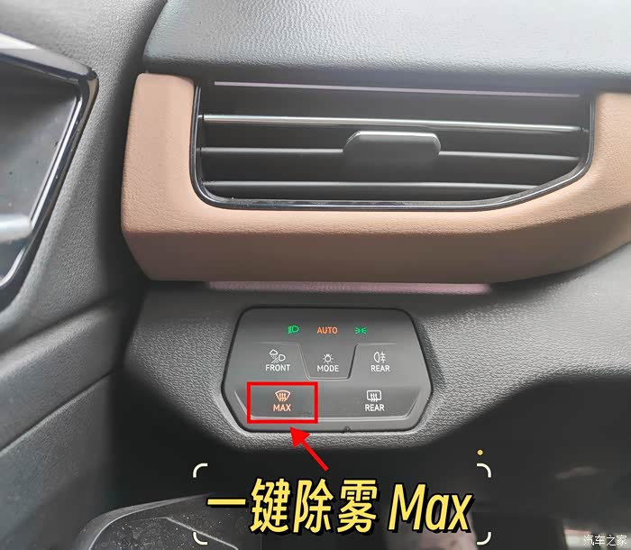 了解过车窗起雾的原理,我们再来看看ID.4X作为一台智能化电动车,它的第一个除雾方法,特别适合新手司机。在主驾驶位的左侧中控台上,可以找到灯光触摸面板,其中最下方就有一个前风窗“一键除雾”按键,橙色指示灯点亮后,空调便会自动启动,并将风量集中在前挡风玻璃出风口,从而有效去除雾气,为驾驶者提供了便捷且高效的除雾体验。