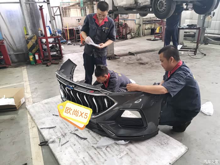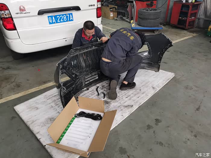 4s店小姐姐安排的很合理,工作人员第一时间就可以给我安装了,然后售后小姐姐带我去办手续,一点时间都不耽搁。于是乎当我再次看到爱车时,小五的前保险杠已经被师傅们拆下来研究了。