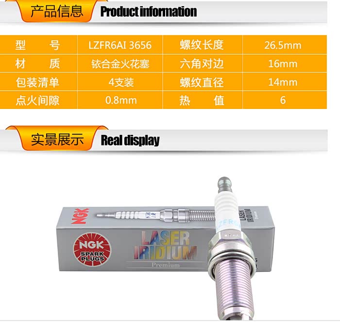 第一款:日本NGK的铱金LZFR6AI 3656,优点:更换后噪音小、提速快、反应灵敏,当然这款价格不菲,寿命在10万公里左右。