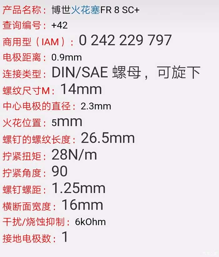 可以看到间隙是0.8-0.9,热值为6,螺纹长度为28MM,螺纹直径14mm,16mm套筒安装。前3个参数至关重要。