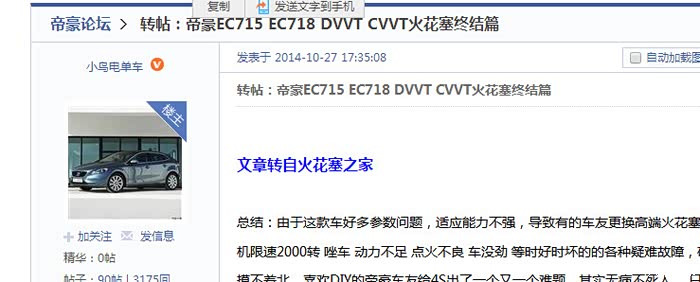 解析到此为止。发本文的目的,是让大家选择东西的时候,自己也动脑子思考下,有些网文,或者说官方客服都不是太可信的。谁知道厂家客服推荐都能有问题呢?出了问题车是你自己的,倒霉也是你自己。火花塞之家推荐的几款火花塞,不知道他们到底有没有实践过?其他几款我没用过,但是火炬一款26.5MM的火花塞我换过试验过,顿挫明显,加速无力各种坑。换回原车28MM的一切正常。我发此文也是自己的个人看法,也许有对也许也有错误,当然此文并非指导性技术文章,主要是和各位帝豪车友交流这方面的心得,也希望各位帝豪车友,如果有找到参数完全符合的高性能火花塞,不妨发上来大家一起探讨。谢谢!
