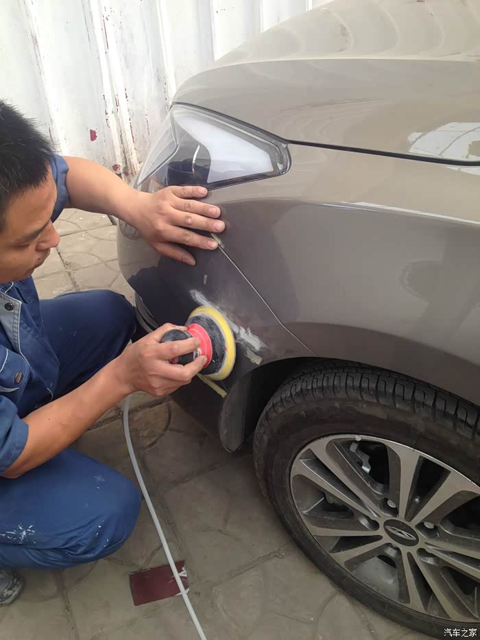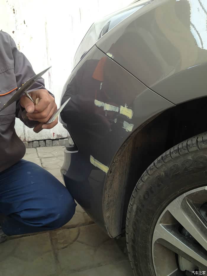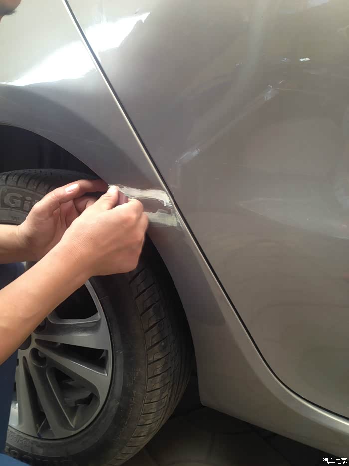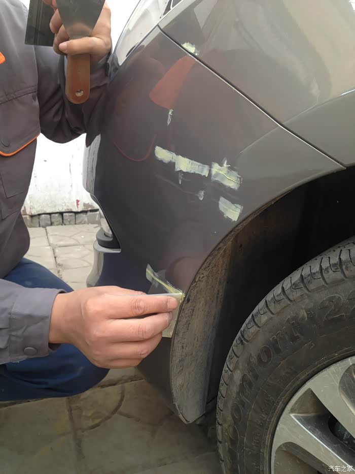下面就是小区的Z型直角转弯道在转弯的时候不小心剐蹭到了墙,漆面没掉,但是金属板凹陷进去了一点。补混合剂,打磨。。。
