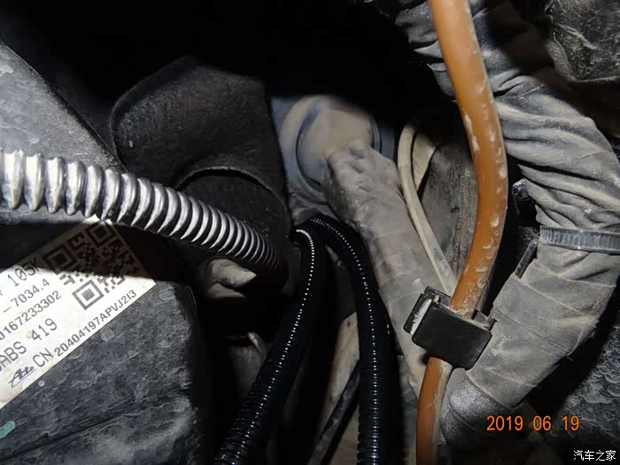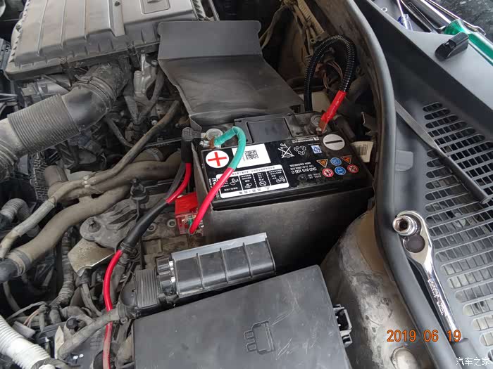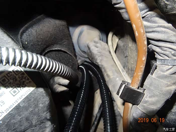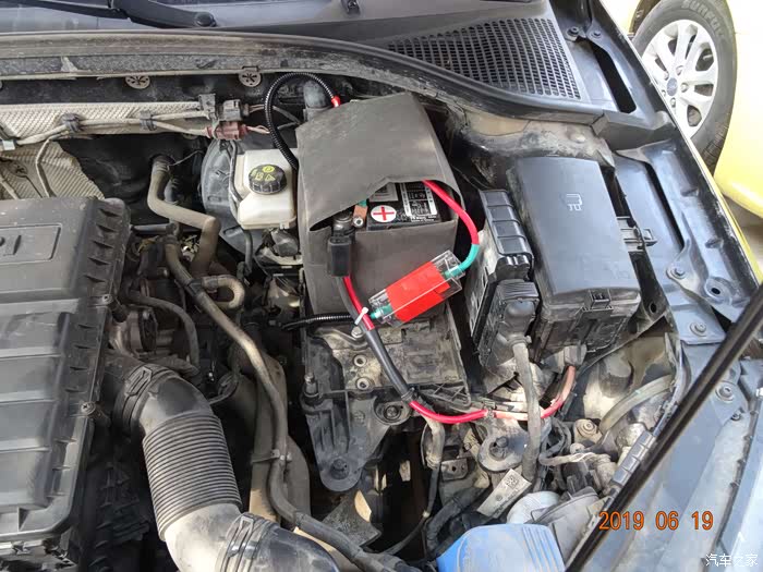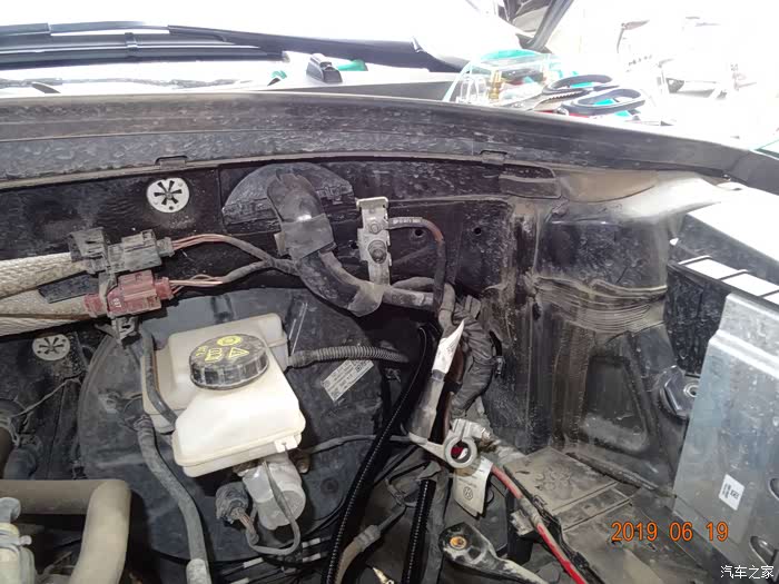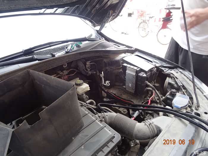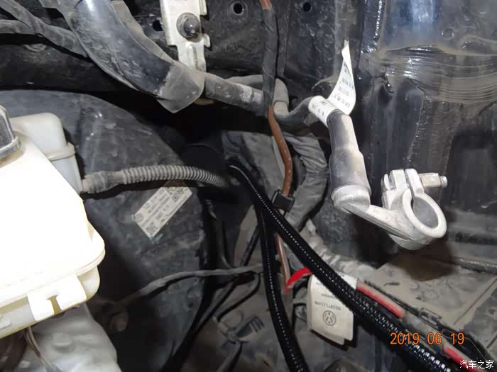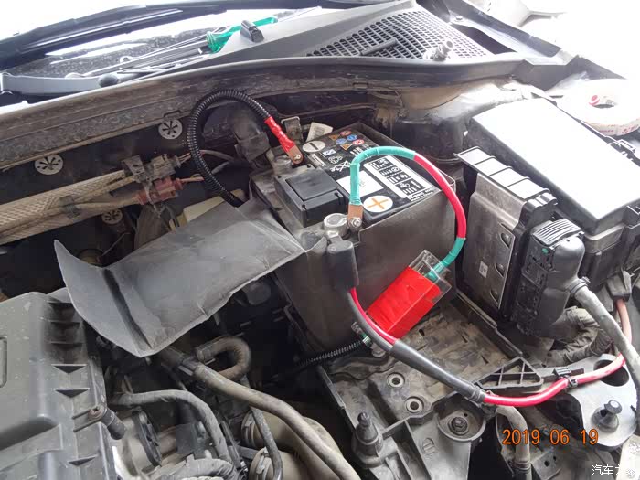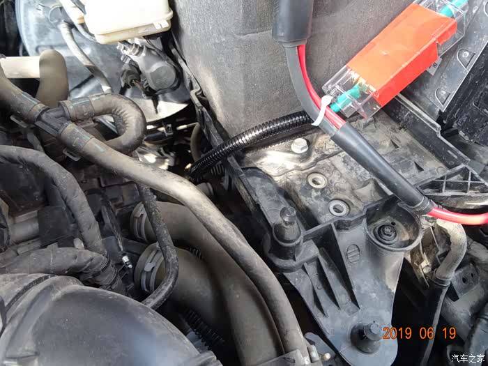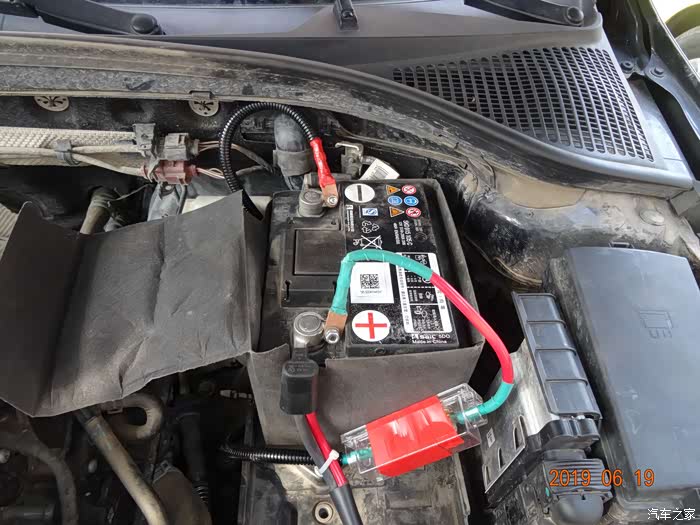 这是拆掉电瓶的样子——因为穿线必须从主线束旁边,而主线束在电瓶后下方,所以必须先把电瓶摘掉。