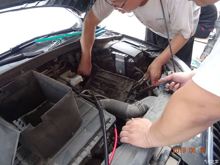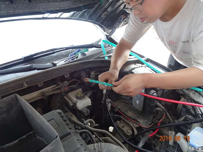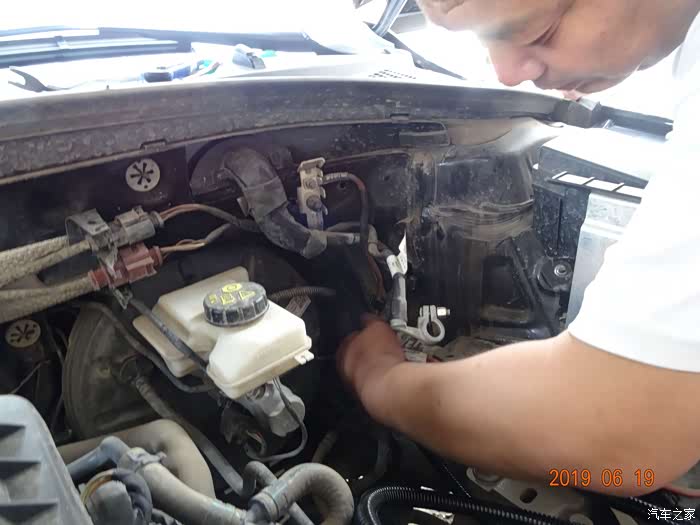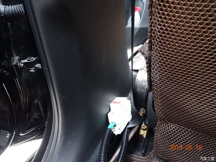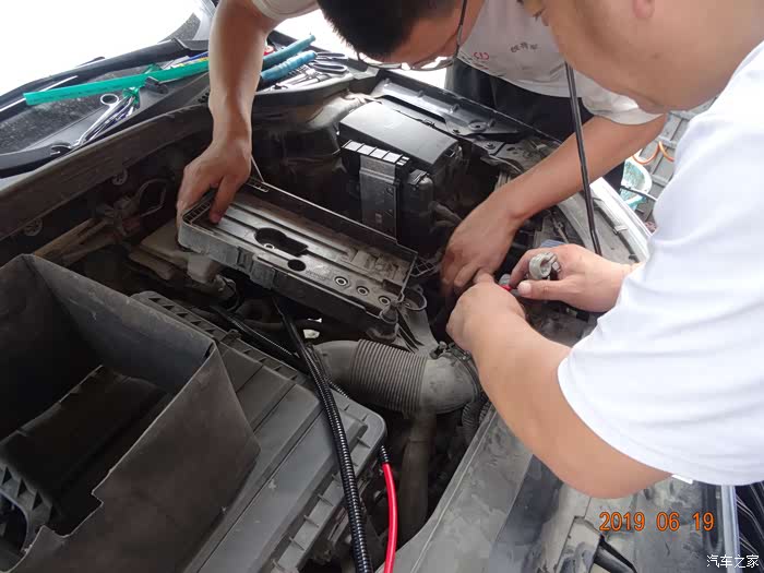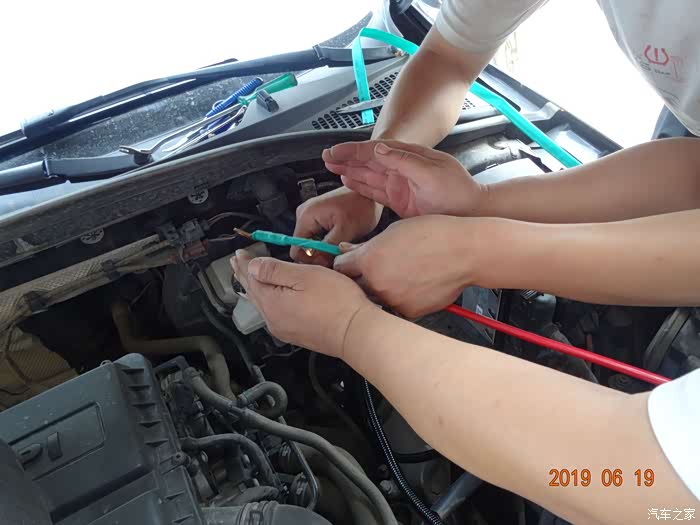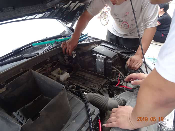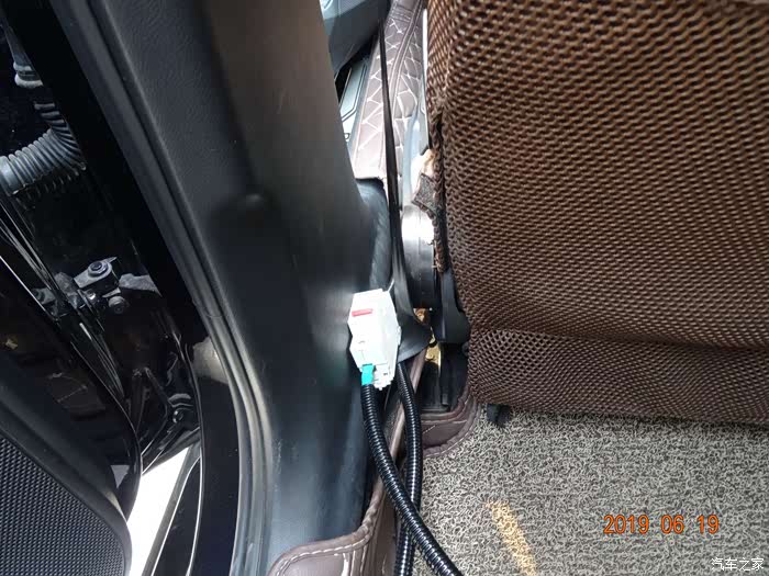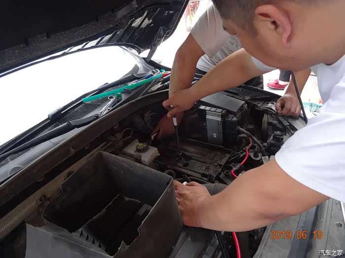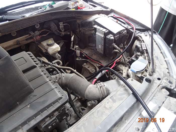 这是拆掉电瓶的样子——因为穿线必须从主线束旁边,而主线束在电瓶后下方,所以必须先把电瓶摘掉。