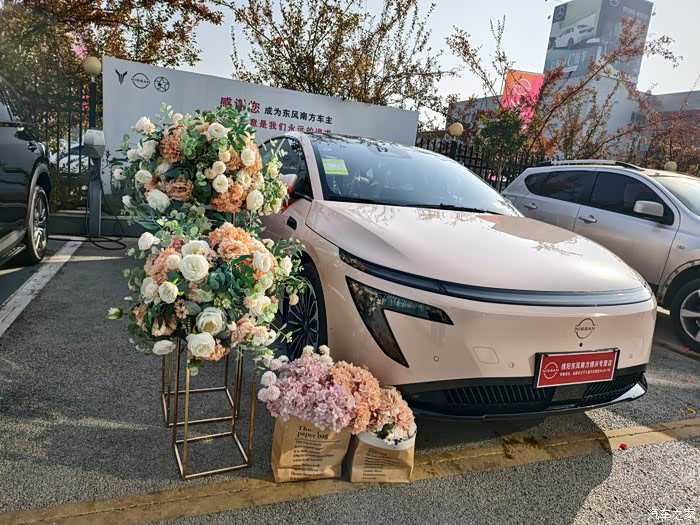 :门口立了鲜花花架,车头摆了粉白小花束,连交车区的背景板都写着 “感谢您成为东风南方车主”。最惊喜的是朋友送的水果花束
