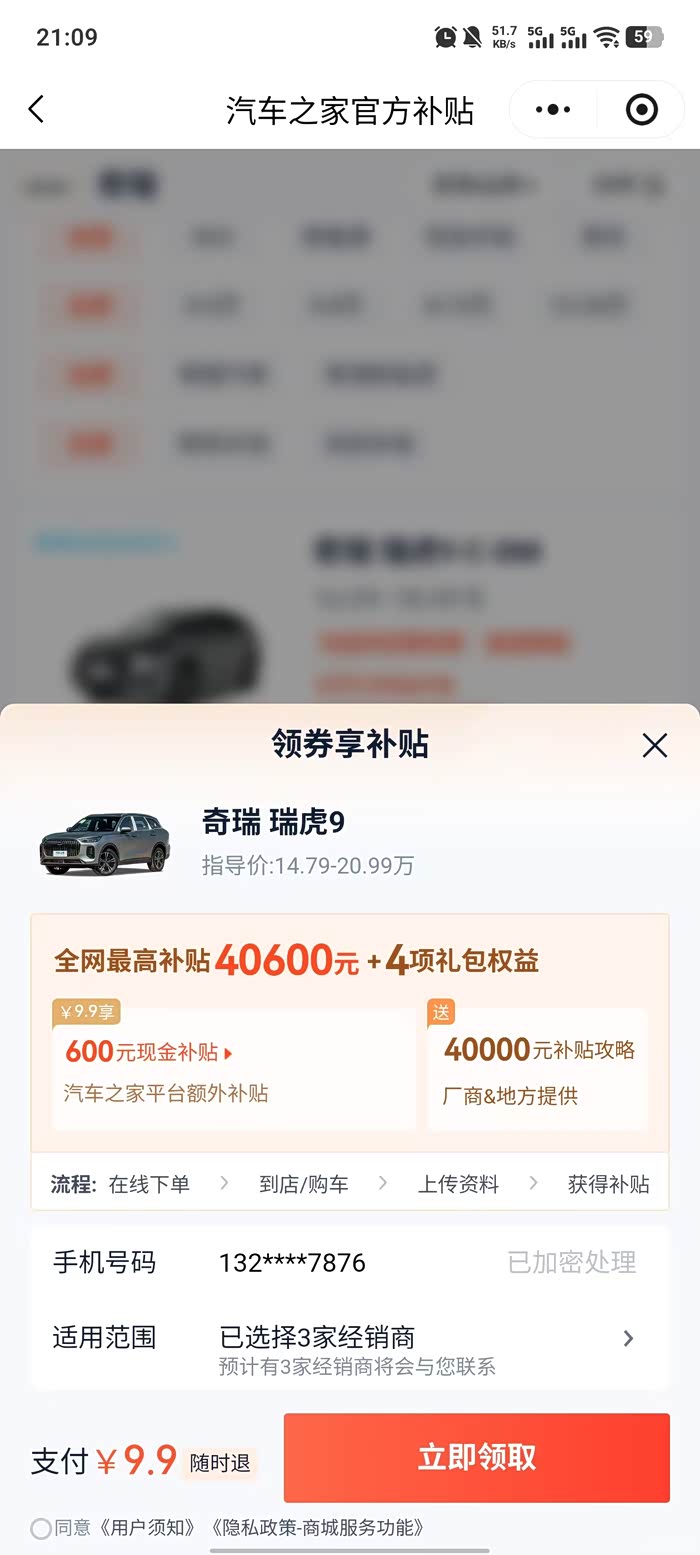 [ 汽车之家 超级补贴 ]更新啦,总计补贴金额上亿元,购车领现金补贴200-3000元不等,此次高额补贴车型涉及市售超1000款主流车型,领取次日-15日内上传发票交强保单有效,全国可享,领完即止,领红包选择意向较高购买门店,不确定门店的,可勾选多个门店,选错可取消重新领取,羊毛党千万不要错过哦!