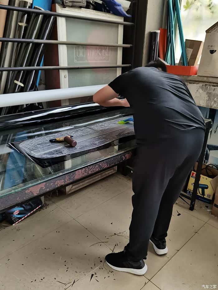 贴膜师傅正在给爱车裁剪后挡风玻璃的贴膜!