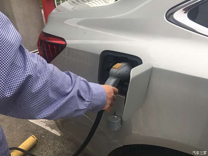把充电枪从充电桩上去下,打开ei6的充电口盖,将充电枪插入插紧,并检查充电口附近是否有杂物等,注意方向不能搞错,ei6是混动的,所以车身两侧都有开口,驾驶员一侧是加油口,副驾驶一侧是充电口。