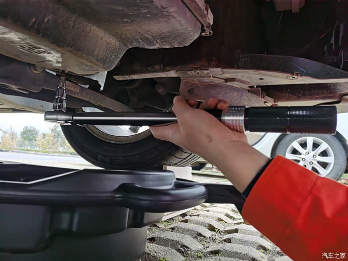 等到变速箱油不流了,把溢流阀和放油螺丝再装上,否则等下拆油底壳,会有油漏出来,油底壳螺丝10mm,共8个
