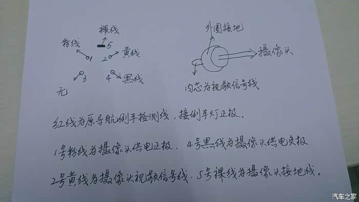 我的是红色倒车检测线与1号粉线接一起然后又接在倒车检测线上 黄的是摄像头来的视频 插大屏后面的9号莲花座上 这根线要加个莲花头 黄线是内芯 外心接打铁也就是和4号5号一起接打铁或是负极线。通用型的后视头这个改造可省略了。