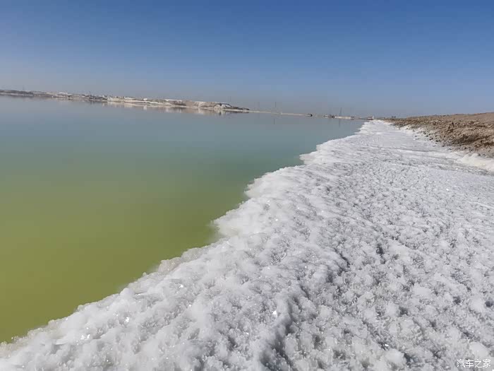 盐湖的水走近一看是黄色的,边上是结晶