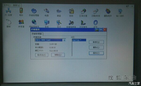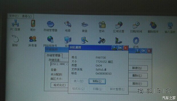 4、桌面双击“我的设备”进入下一层界面,双击“控制面板”→进入下一层界面→双击“存储管理器”→进入下一层界面→储存信息中选择DSK1:MMC Card,点击右下侧“属性”按钮,在出现的对话框中点击“卸载”再点击“格式化”,→勾选“快速格式化”,点击“开始”格式化内存卡。