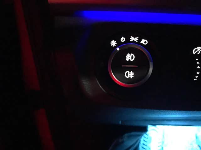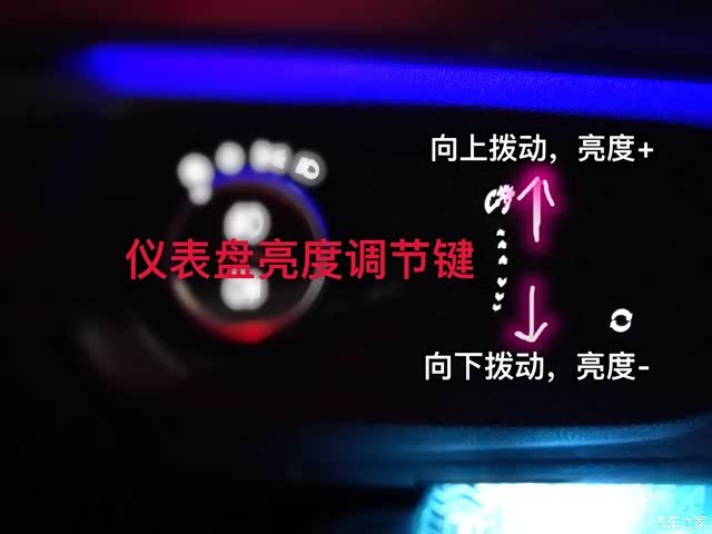 仪表盘亮度设置按键在“车灯总开关”与“氛围灯按键”之间。通过向上/向下拨动,来调节仪表盘显示亮度。