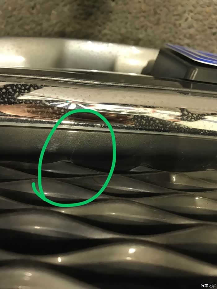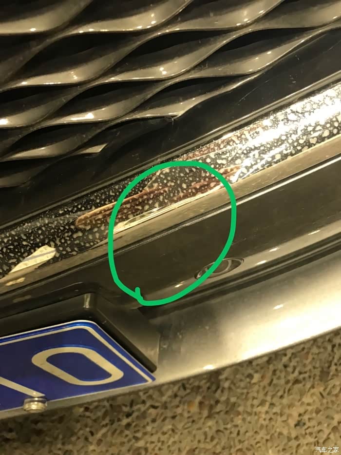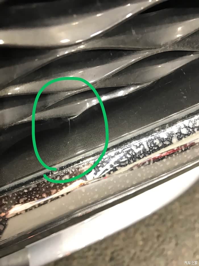 由于前段时间老下雨,没洗车,所以还不好找伤痕。本以为逃过一劫,但仔细一找,发现了两处,一是中网格栅被撞裂了。