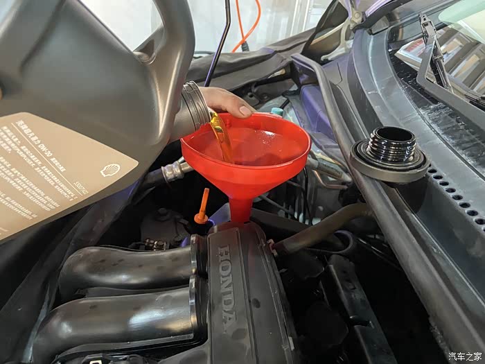 本田的机油尺相当难观察,不知道设计师怎么想的。反正我只看上限和下限的液位孔,有没有填上机油