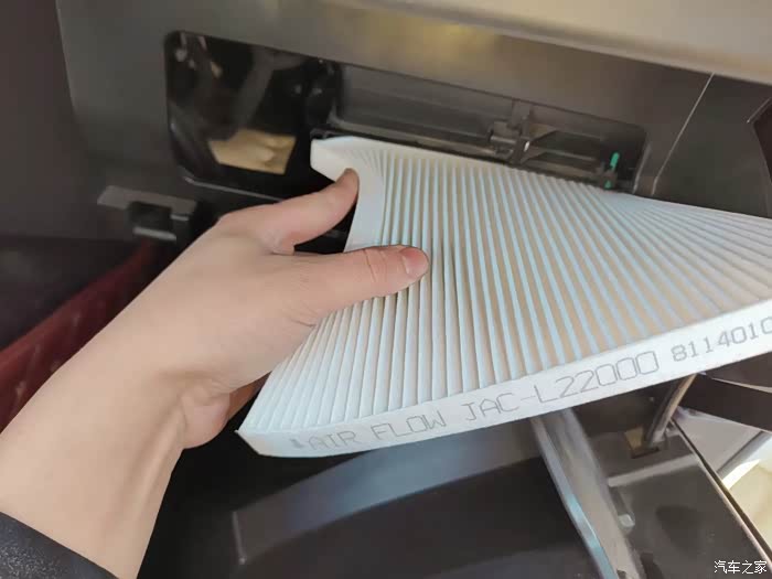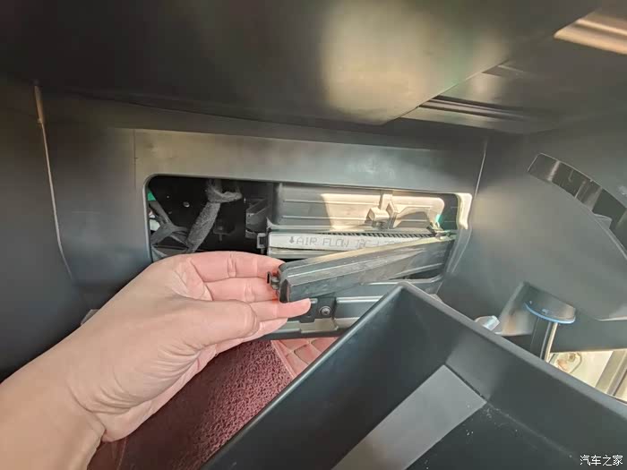 打开杂物盒,向内推动杂物盒两侧以脱开卡爪,然后拉出杂物箱,并脱开下部卡爪,空调滤芯位置在副驾驶储物盒后面,需要将储物盒取下来 , 双手靠拢向里用力,储物盒是一定韧性的,不暴力拆卸是不会坏掉的