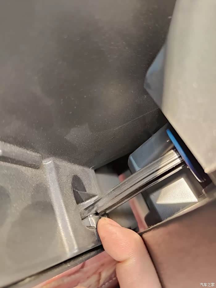 打开储物盒就能看到有个阻尼器,如图手指位置用一字螺丝刀或实用工具将阻尼器取下防止更换空调滤芯时将阻尼器弄断
