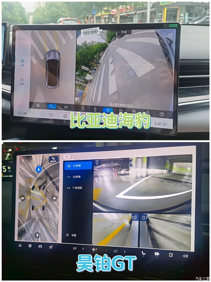 再说说倒车影像,作为平时用车中很实用的一点,海豹的画面设置我感觉更加适合车主,毕竟左侧是车身俯视角度、右侧是车身侧视角度符合常用逻辑;而昊铂虽然具有透明底盘,但是无论是2D影像还是3D影像,视图最多但感觉很乱,不够直观。