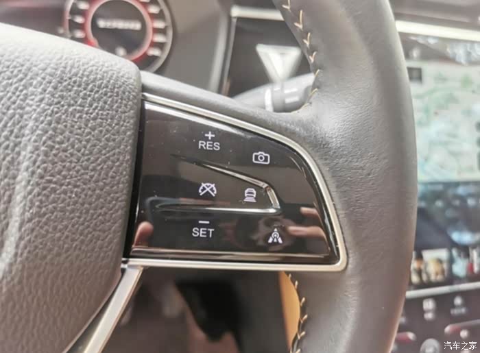 右边的按键有:自适应巡航开启,巡航加速,巡航减速,巡航取消键,中间右边那个是跟车巡航的距离设置键,开启自适应巡航后,能测定与前车距离,并保持设置的距离跟车自动行驶。