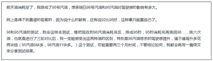 其实我不只是进行了三轮的测试,而是进行了五轮的测试,就是加200元95,用完,换200元98,用完,再换回95……这样轮流测试,为了避免单品牌的误差,我前面三轮用的中石化,后面两轮,分别用中石油和中油BP的,测试后的最大感受是: