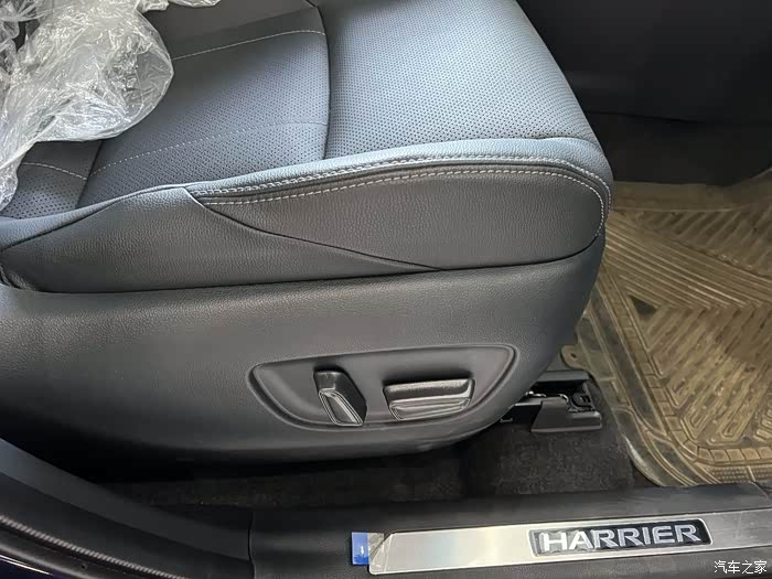 Harrier车门的扶手以上位置全部采用了皮革+缝线的包裹。覆盖面积比RAV4大,并且触感细腻。RAV4需要买到PLUS以上配置才会有皮革包裹的门板,不过材质也是较为粗糙的荔枝纹皮革。