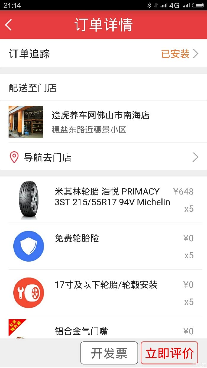 买的时候碰上搞活动,648.00,五条包安装,金属气嘴3240.00接着找一家靠谱的安装店,很容易,在软件上看安装最多的那家,就是他了。